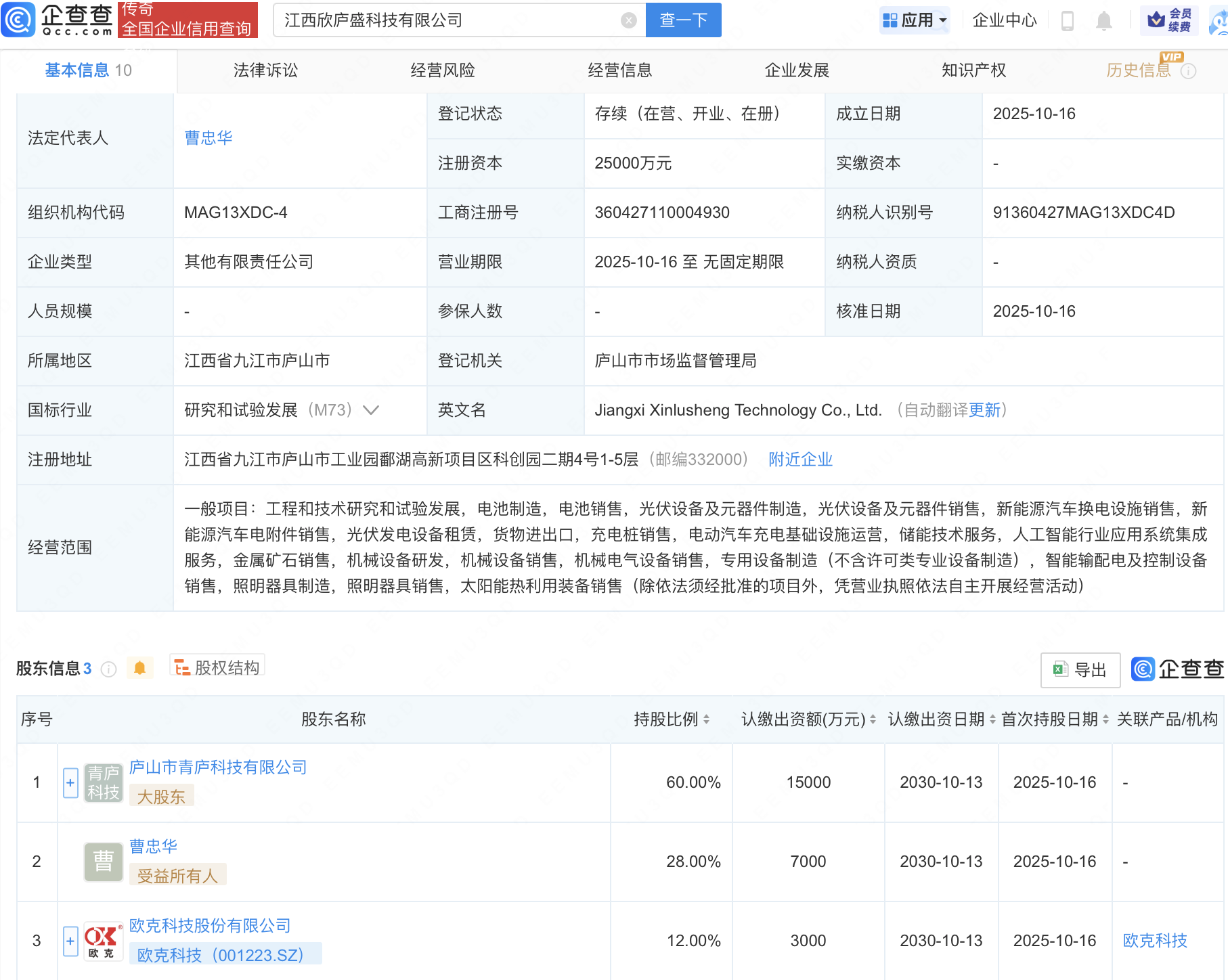 近日,江西欣庐盛科技有限公司成立,注册资本2.5亿元,经营范围包含:电池制造,电池销售,充电桩销售,电动汽车充电基础设施运营,储能技术服务,人工智能行业应用系统集成服务等。企查查股权穿透显示,该公司由欧克科技(001223)等共同持股。